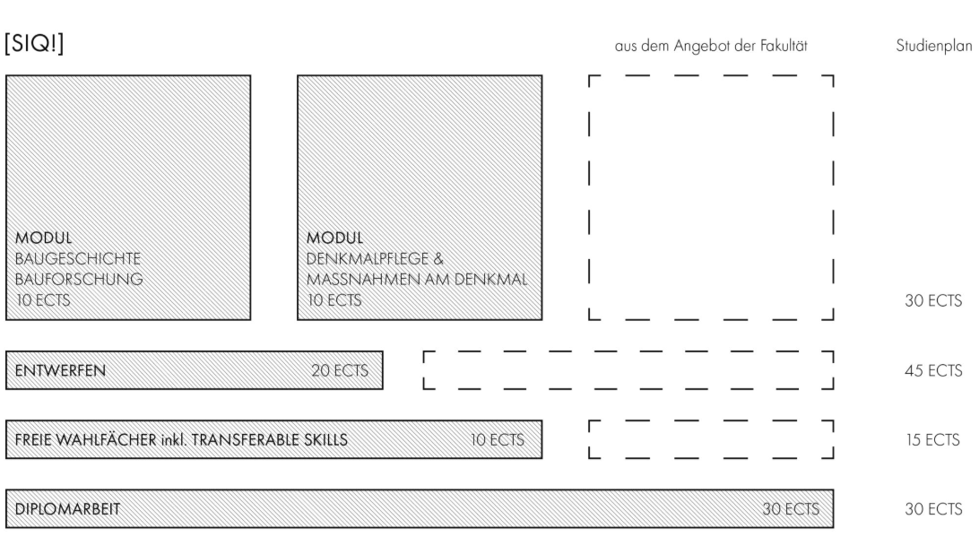 Das Ziel von [SIQ!] Bauforschung.Denkmalpflege.Baupraxis im Bestand ist, Studierenden des Masterstudiums Architektur an der TU Wien die Möglichkeit zu geben, sich ihre Aneignung von Kenntnissen in historischer Bauforschung, Denkmalpflege und Bauen im Bestand nachweisen zu lassen. Unter Beibehaltung von Kammerfähigkeit und der freien Belegung eines Drittels des zu erfüllenden Umfangs an Lehrveranstaltungen, versteht sich die Fokussierung als eine Erweiterung von Chancen im Berufsfeld.