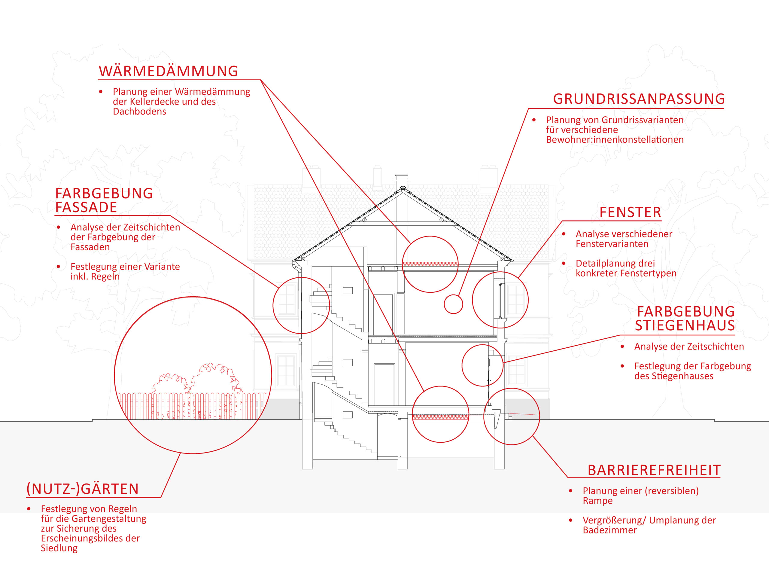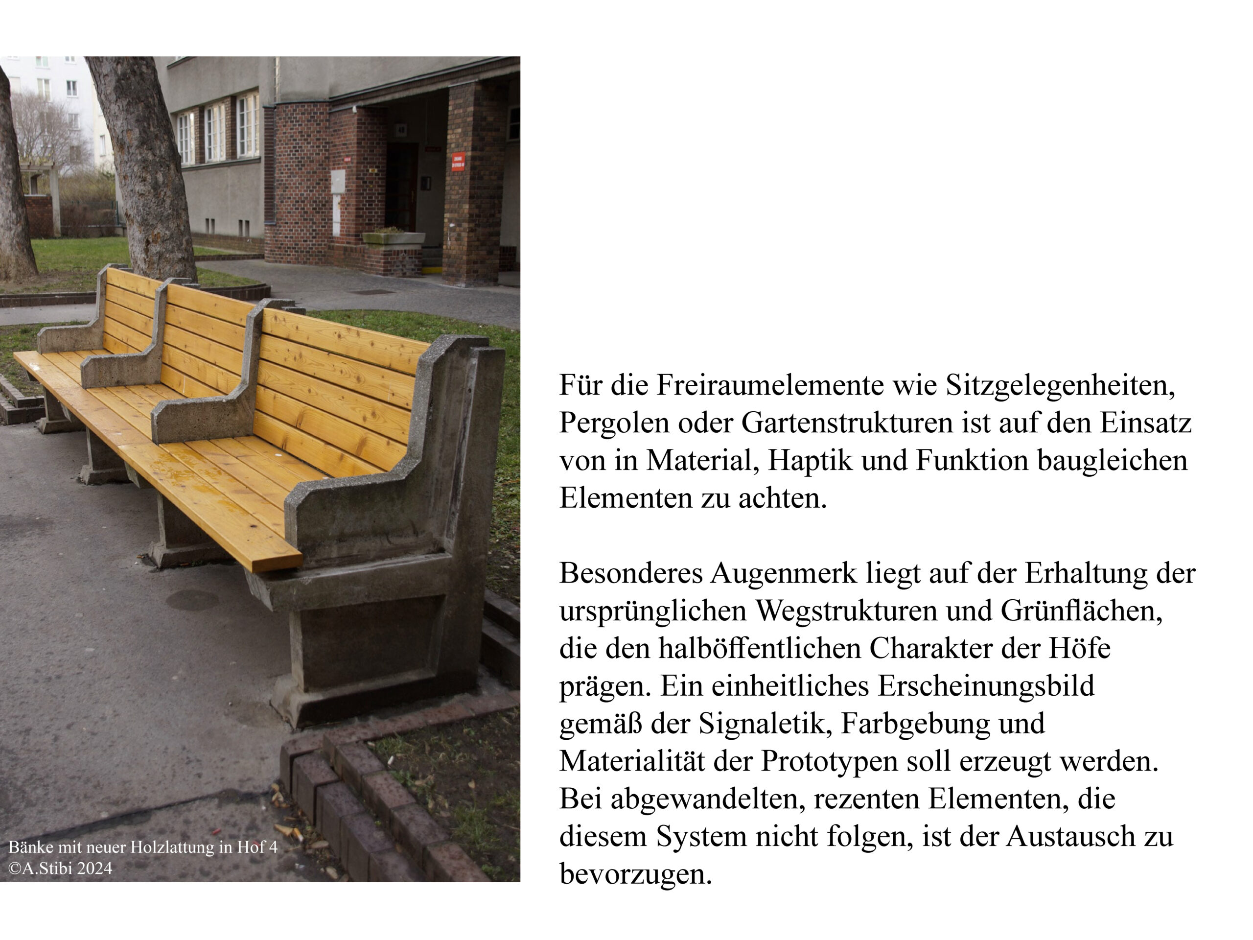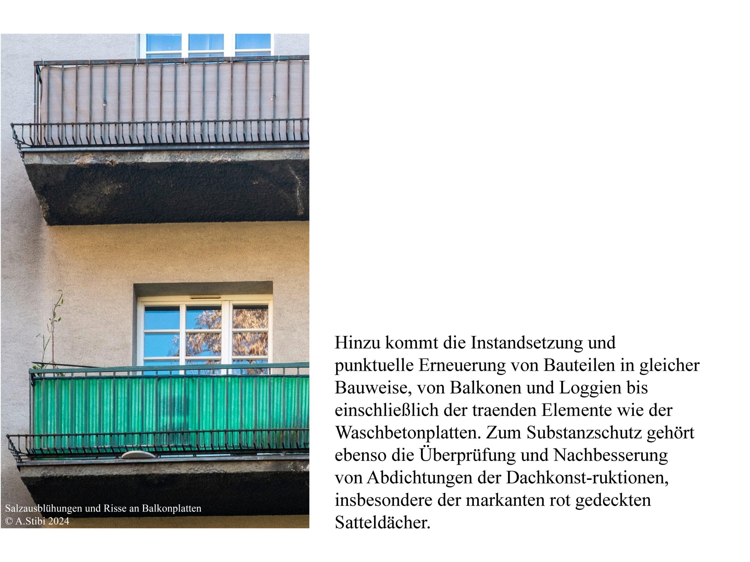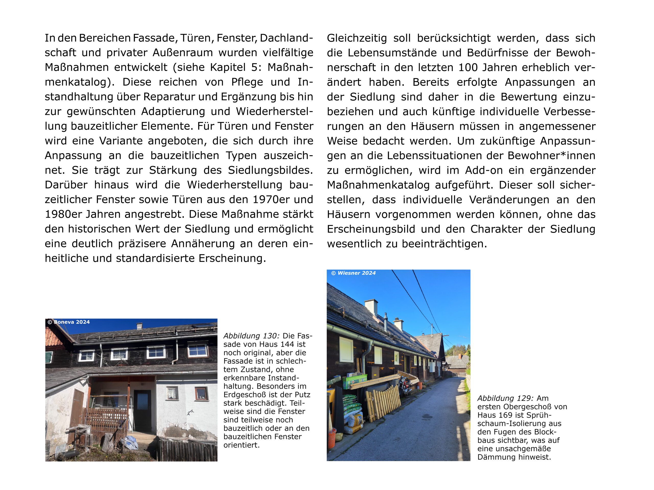 In der Logik des Denkmalpflegeplans wurden, auf Basis des erfassten Bauteilkatalogs und der Wertung in Bedeutungsebenen, strategische Maßnahmen zur Pflege, Reparatur, Rückführung und Adaption entwickelt. Mit starker Einbindung der Bewohner:innen erfolgt die Erhaltung in kleinteiligen, individuellen Schritten gemäß den erfassten Bauteilen. Die architektonische Substanz bleibt gewahrt, Schäden werden gezielt im Sinne des Katalogs repariert, um die ästhetischen und sozialen Qualitäten gemäß der bauzeitlichen Intention zu sichern.