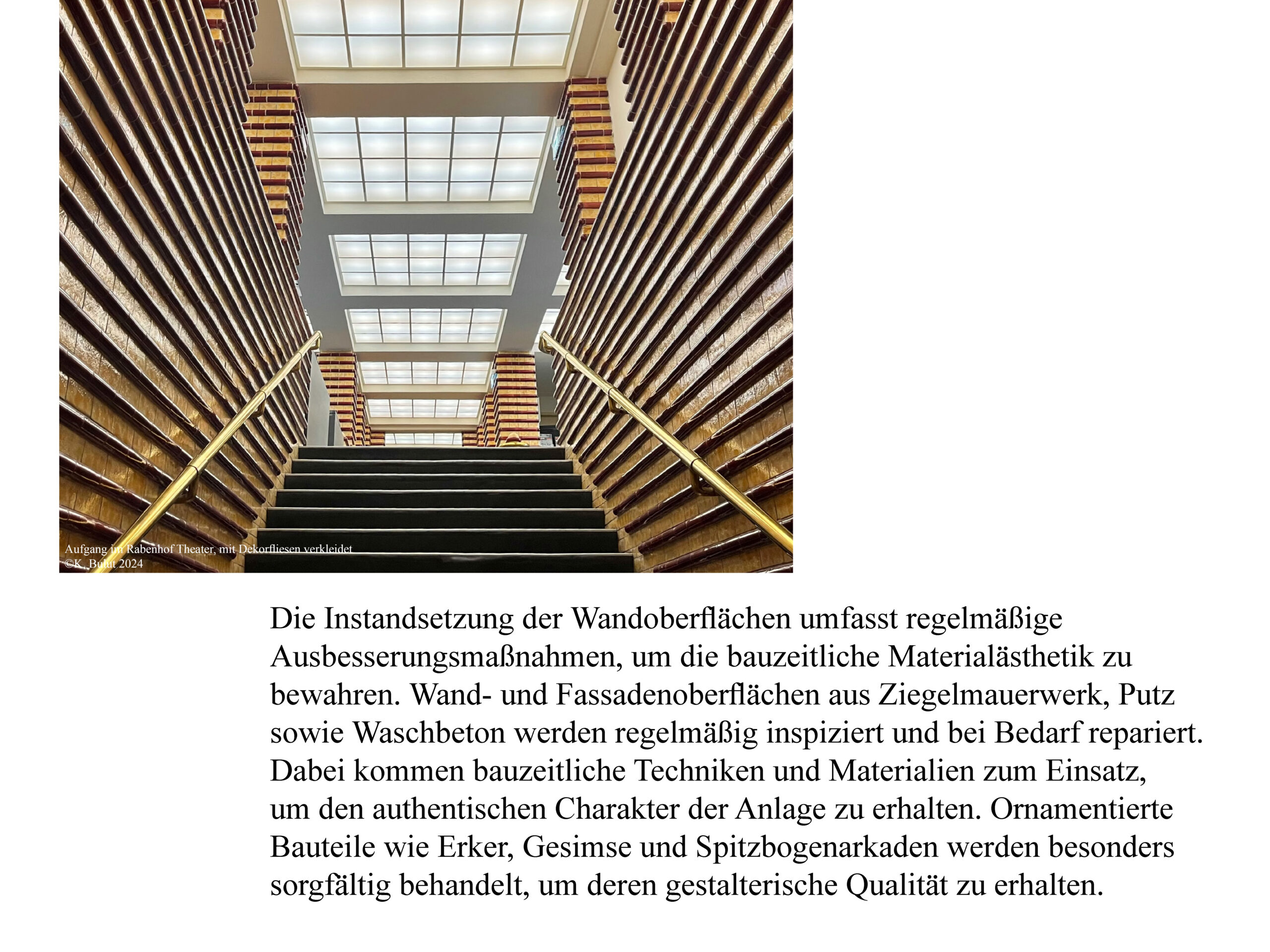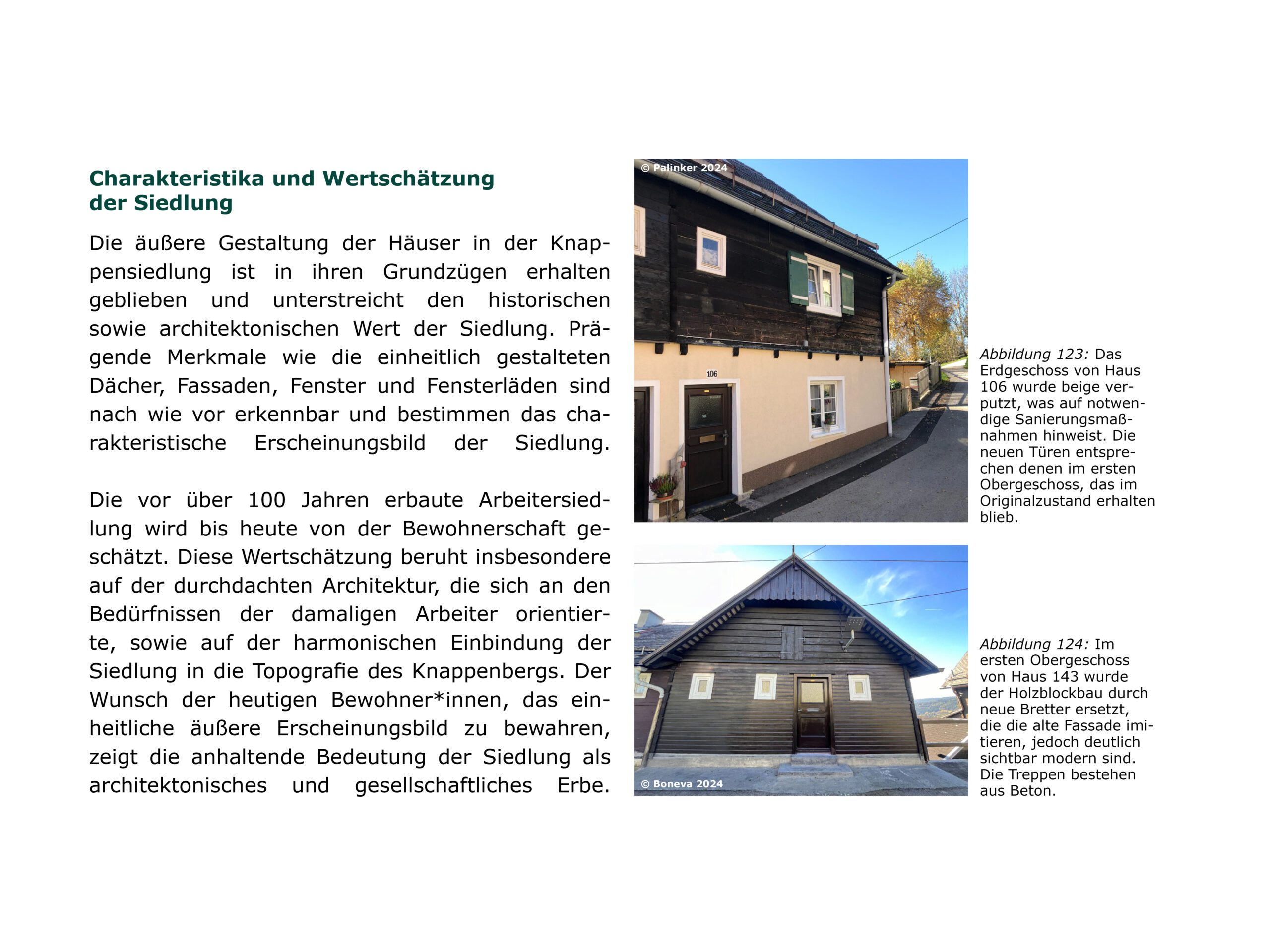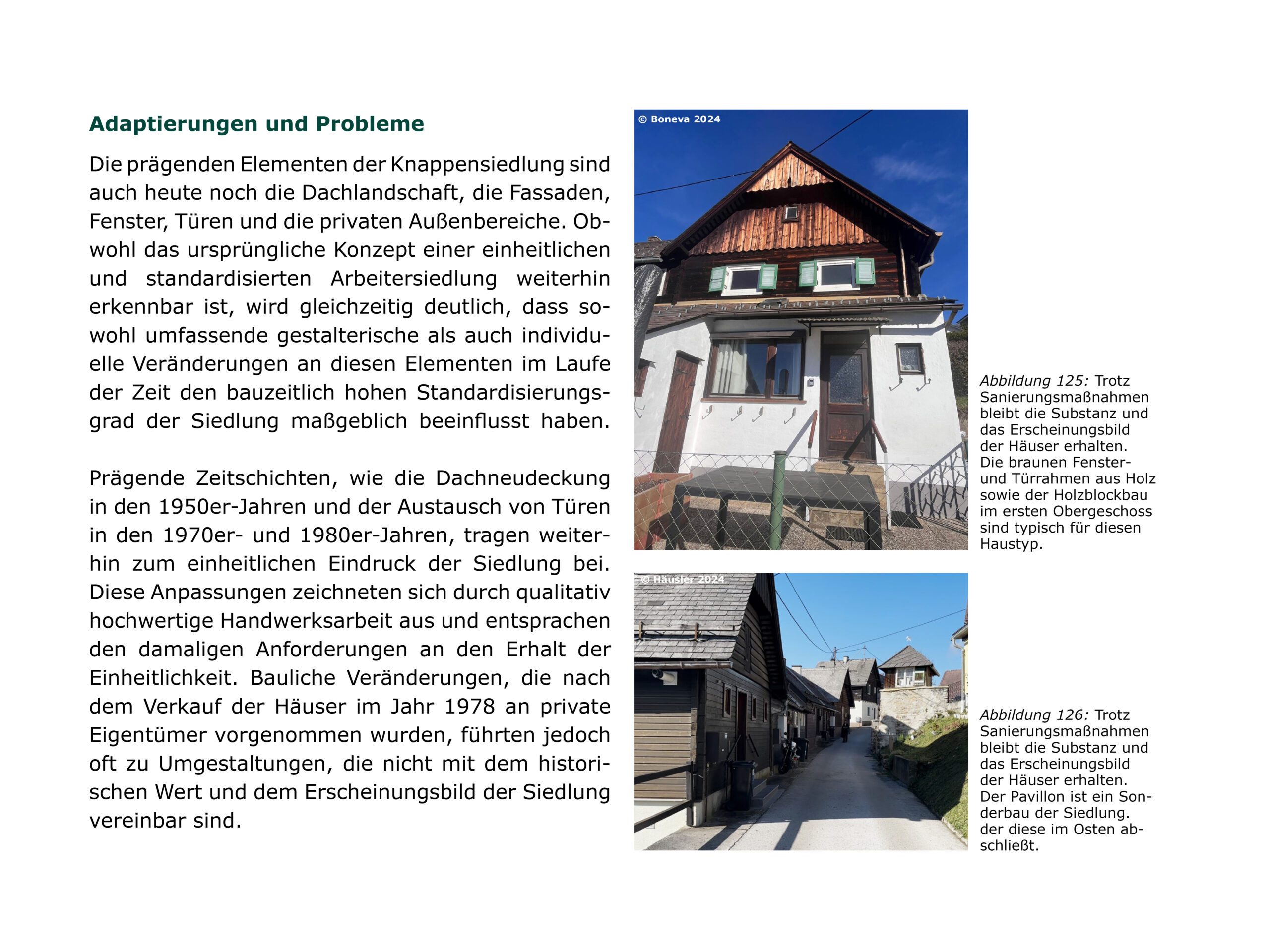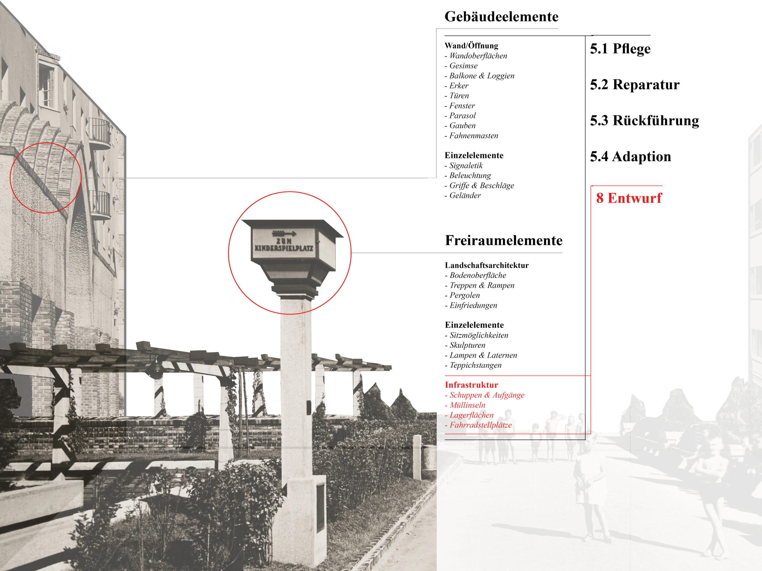 In der Logik des Denkmalpflegeplans wurden, auf Basis des erfassten Bauteilkatalogs und der Wertung in Bedeutungsebenen, strategische Maßnahmen zur Pflege, Reparatur, Rückführung und Adaption entwickelt. Mit starker Einbindung der Bewohner:innen erfolgt die Erhaltung in kleinteiligen, individuellen Schritten gemäß den erfassten Bauteilen. Die architektonische Substanz bleibt gewahrt, Schäden werden gezielt im Sinne des Katalogs repariert, um die ästhetischen und sozialen Qualitäten gemäß der bauzeitlichen Intention zu sichern.