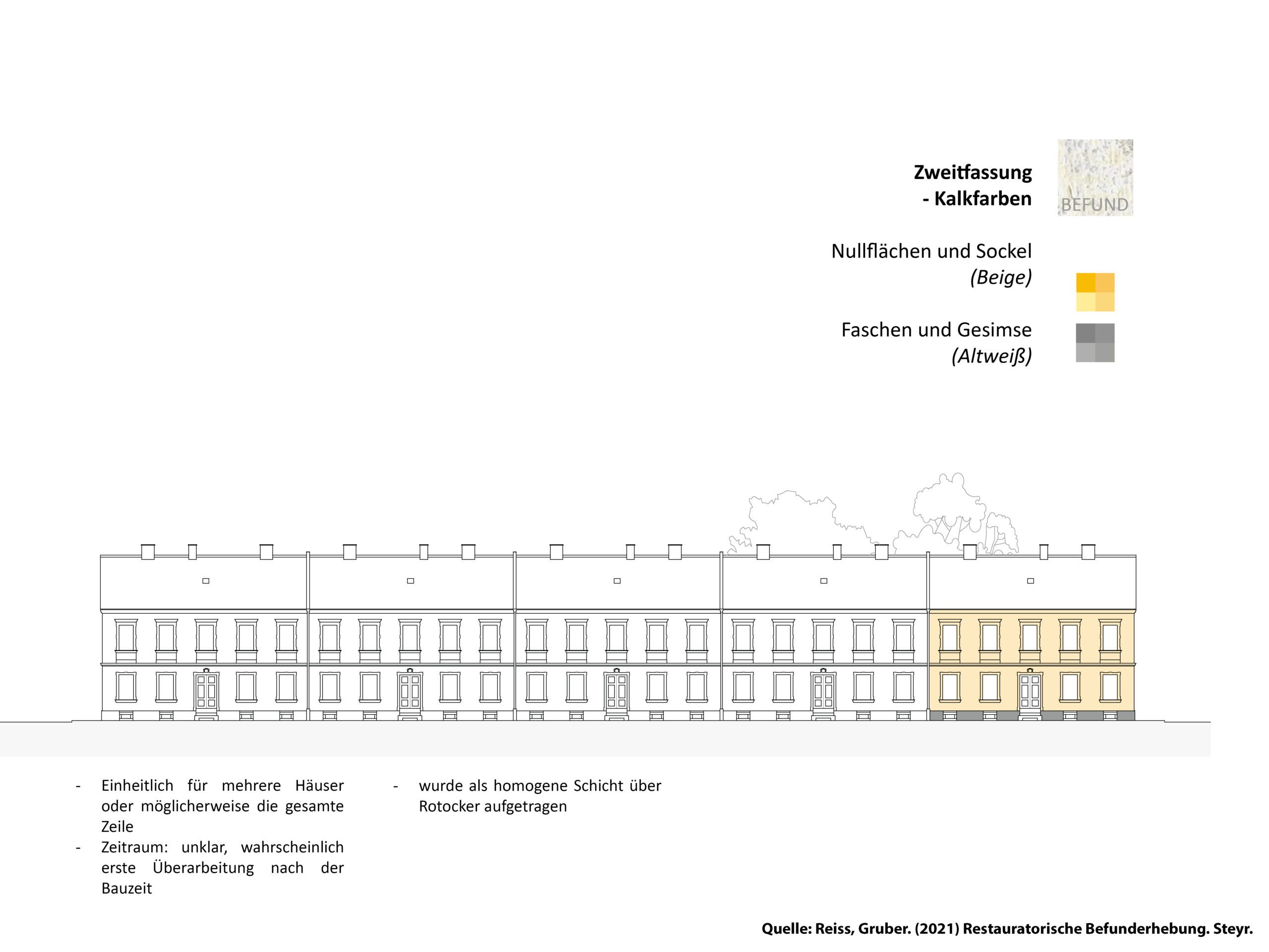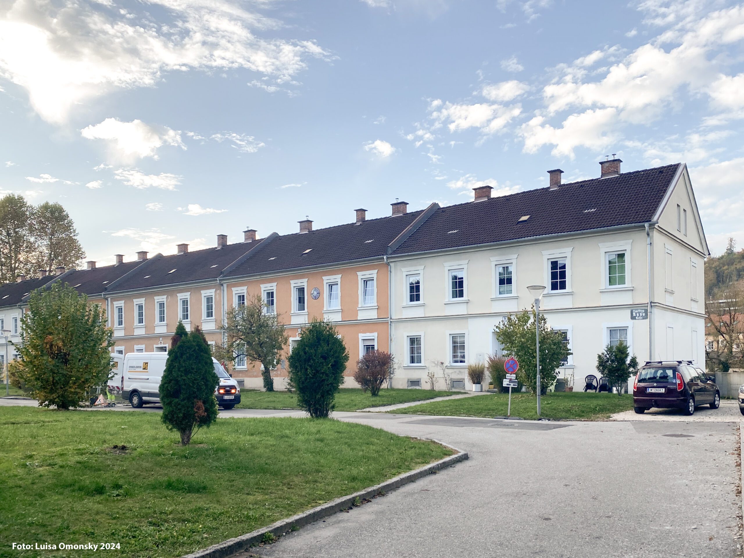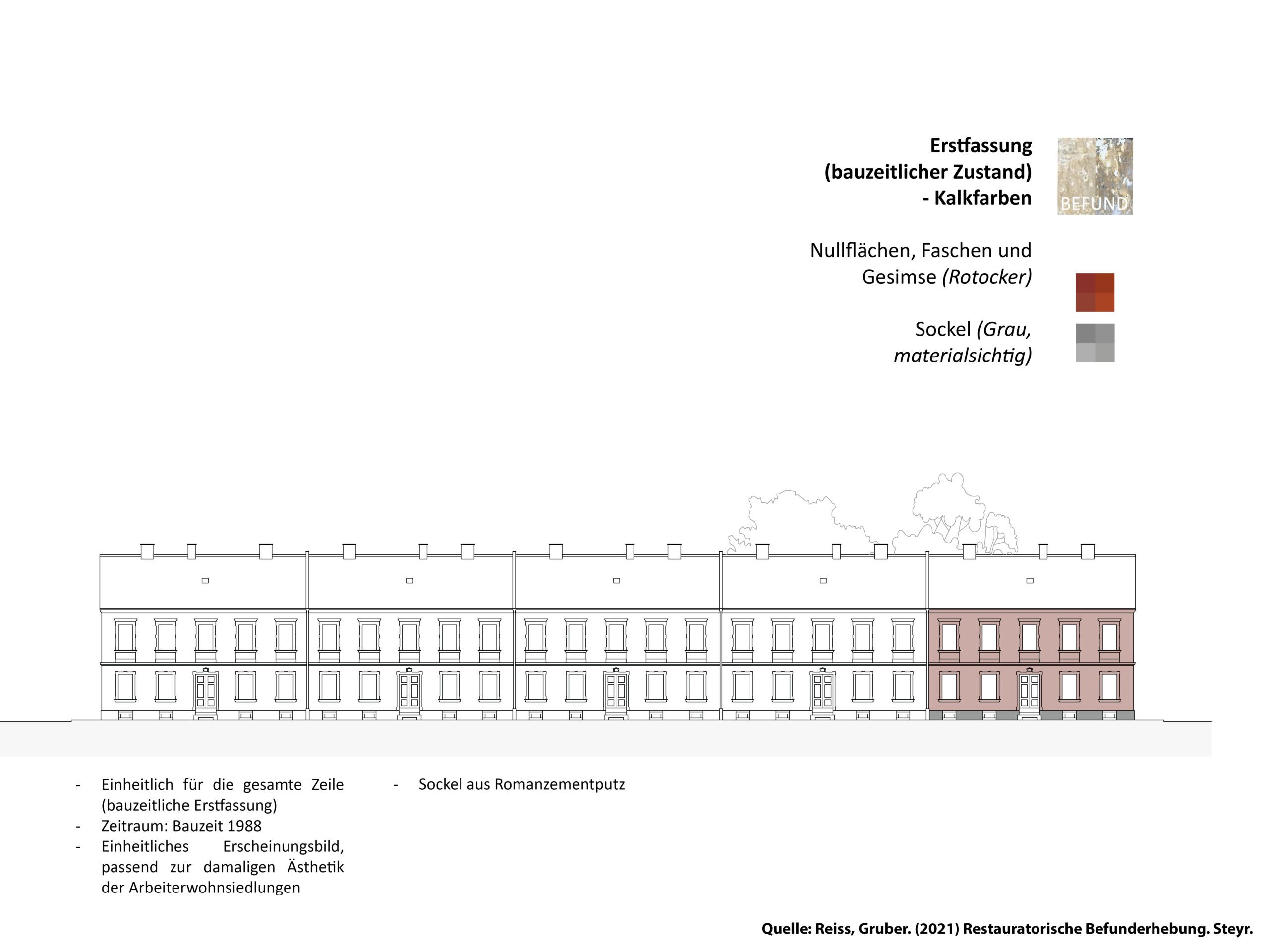 Der Entwurf zur Eysnfeldsiedlung in Steyr baut auf dem im Zuge der Lehrveranstaltung „Planen, Pflegen und Wohnen“ erarbeiteten Denkmalpflegeplan auf. Dabei wurde der Leitfaden des Bundesdenkmalamts aus dem Jahr 2024 angewendet und in der Auseinandersetzung mit dem Bestand konkret erprobt. Ziel des Entwurfs ist es, den historischen Charakter der denkmalgeschützten Arbeitersiedlung mit ihrer zeilenartigen Struktur und den (Nutz-)Gärten zu bewahren und zugleich an heutige Wohnbedürfnisse anzupassen. Im Mittelpunkt des Entwurfs steht eine umfangreiche Variantenanalyse, bei der unterschiedliche Perspektiven – denkmalpflegerische, gestalterische und soziale – gegeneinander abgewogen wurden. Zentrale Maßnahmen sind Grundrissvarianten, barrierefreie Zugänge, die reversible Dämmung von Kellerdecke und Dachboden sowie ein differenziertes Farbkonzept auf Basis restauratorischer Befunde. Auch Fenster- und Stiegenhausgestaltung werden präzise entwickelt. Die Anliegen der Bewohner:innen flossen dabei aktiv in den Entwurfsprozess ein.