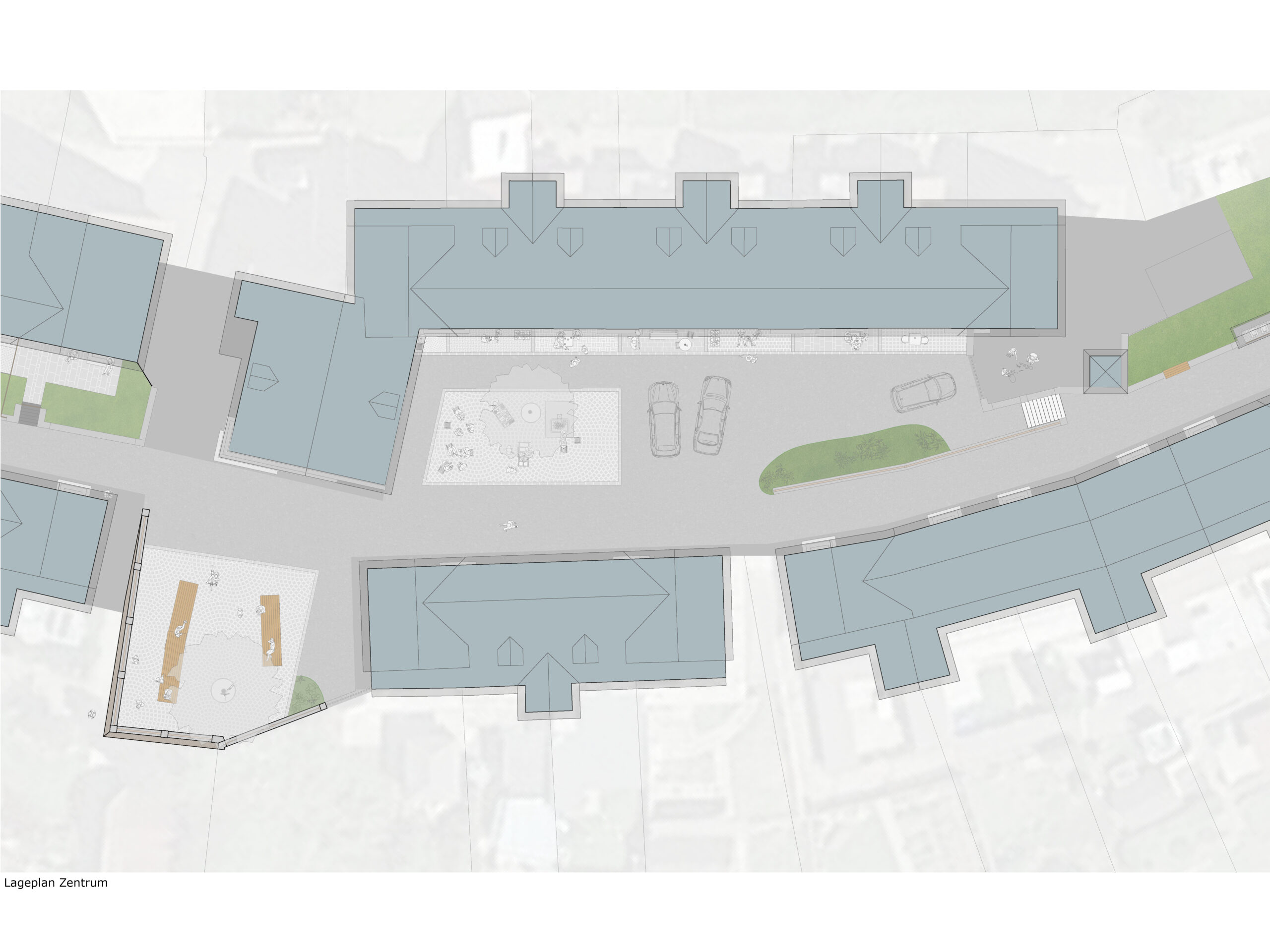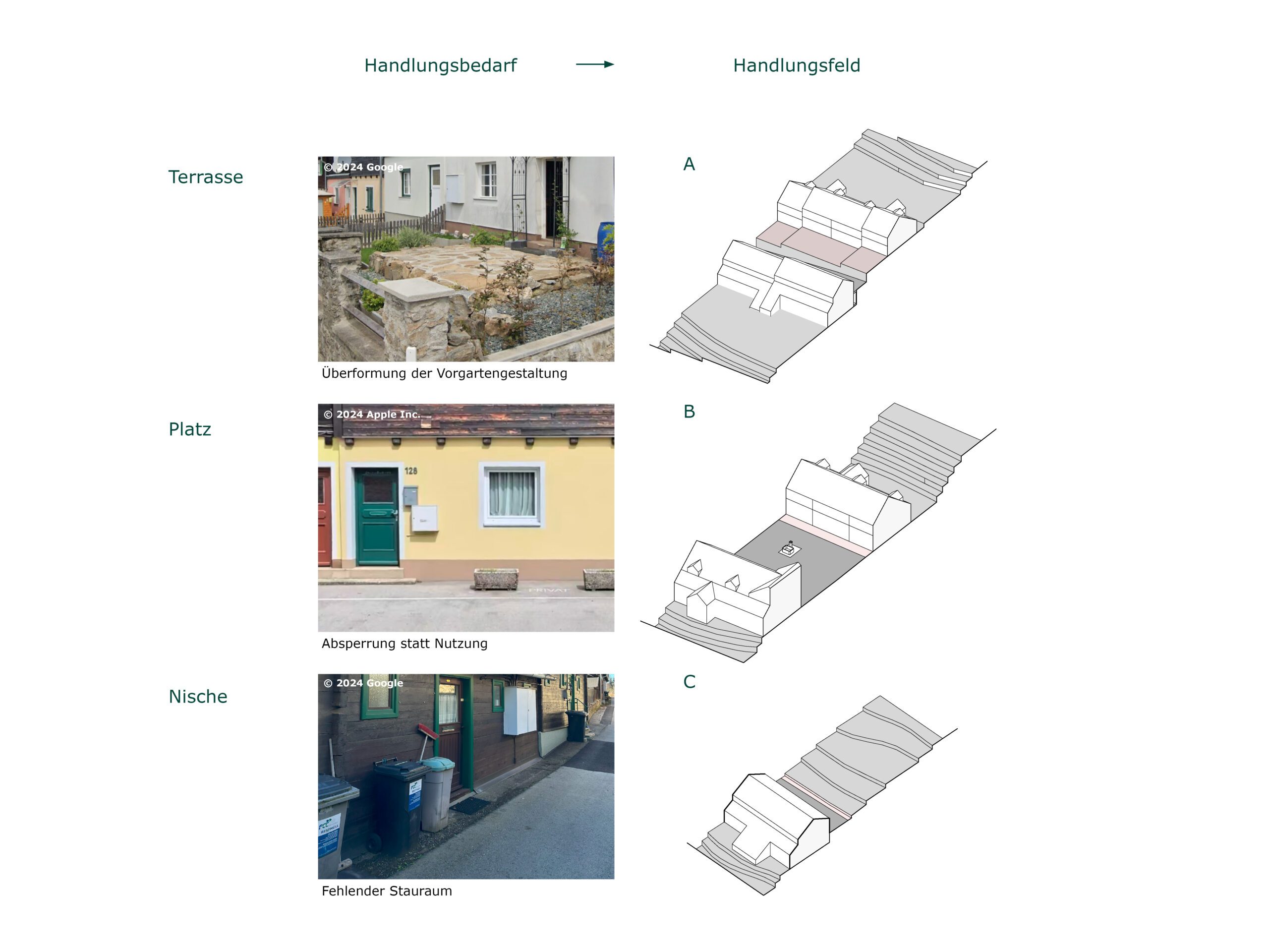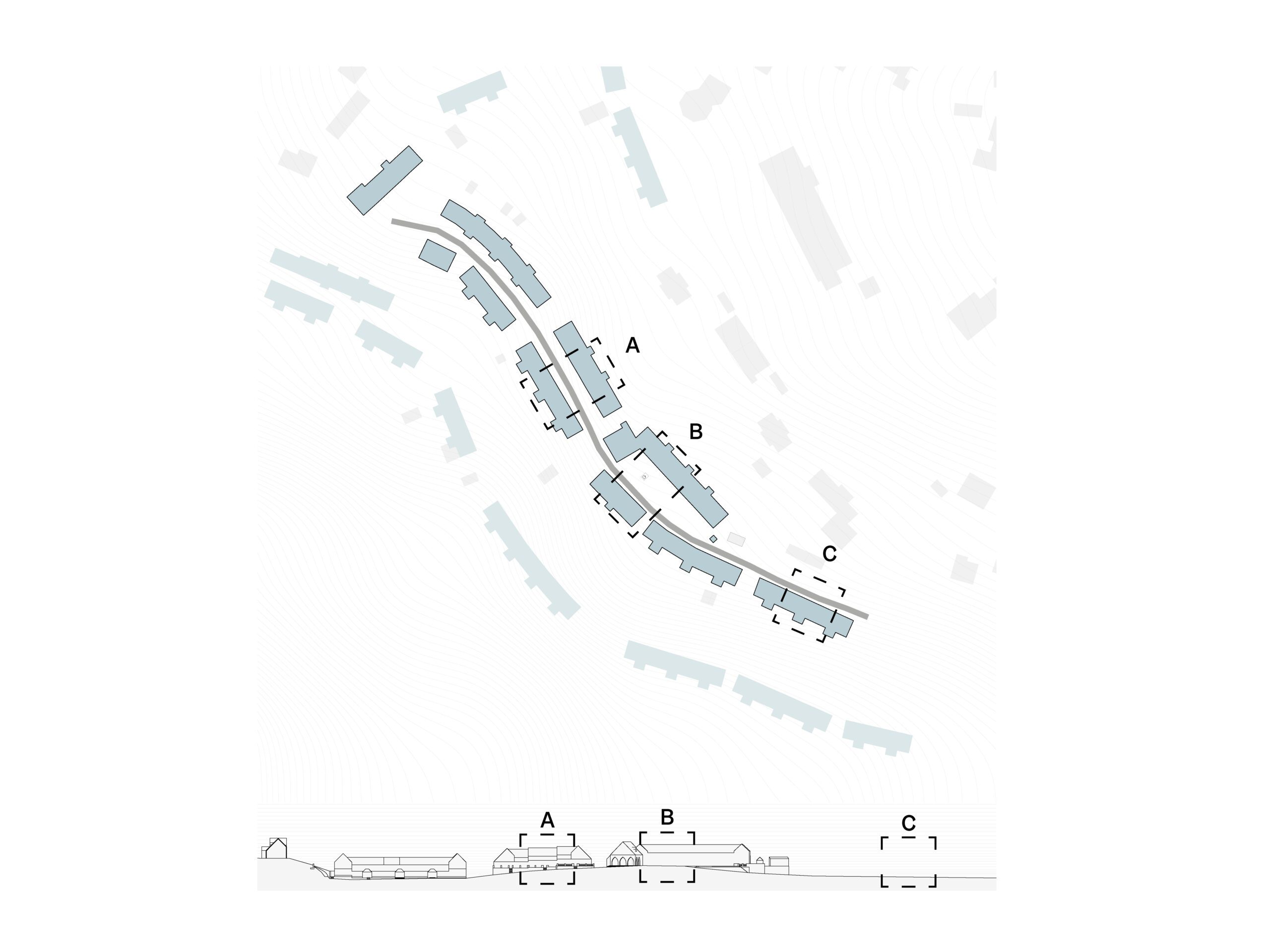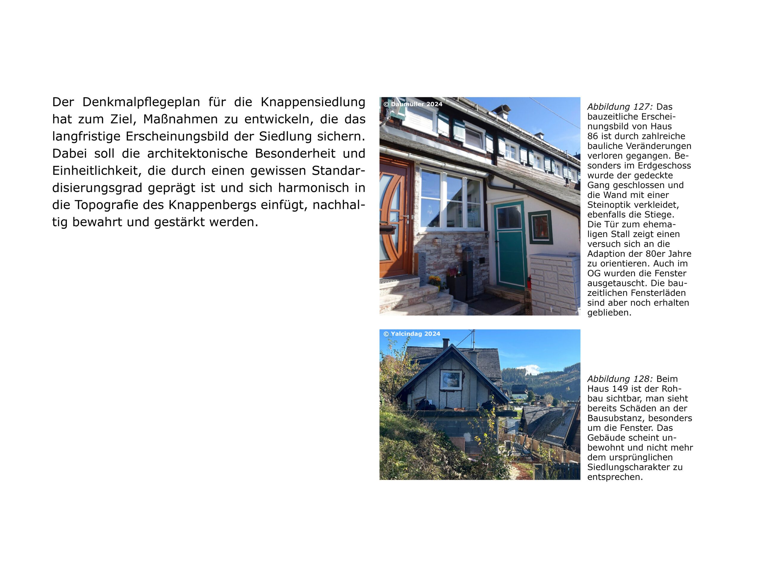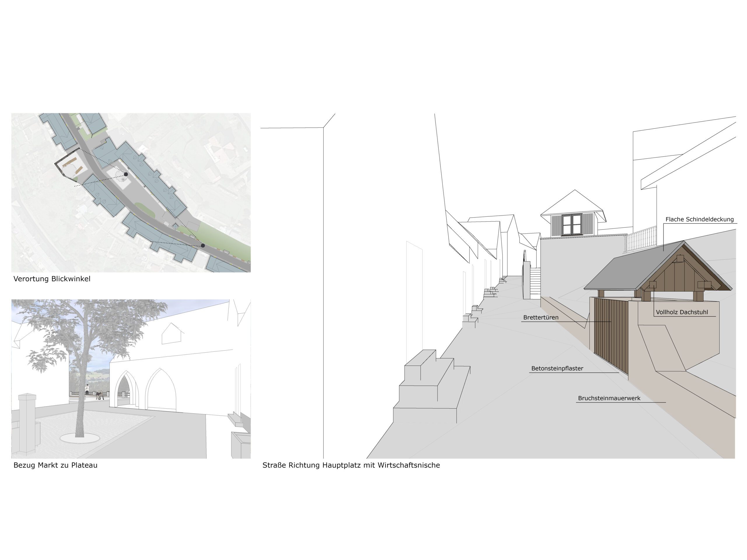 Der Entwurf zur Knappenbergsiedlung verfolgt das Ziel, den Siedlungsraum behutsam weiterzuentwickeln, ohne die bestehende Struktur zu überformen. Es werden platzgestalterische Maßnahmen vorgestellt, die eine qualitative Aufwertung und bessere Nutzbarkeit im und um den Straßenraum ermöglichen sollen. Der Ansatz basiert auf punktuellen, sensiblen Eingriffen, die den denkmalpflegerischen Charakter respektieren. Die Situationen A, B und C (Terrasse, Platz und Nische) beschreiben exemplarische Maßnahmen, die als Regelwerk für Veränderungen in privaten Bereichen dienen können. Zentrale Bedeutung erhält der neu gestaltete Hauptplatz mit einem ergänzenden Aussichtsplateau, das als identitätsstiftender Ort gedacht ist. Diese Intervention soll das Gemeinschaftsgefühl stärken und neue Aufenthaltsqualitäten im Zentrum schaffen. Der Entwurf zeigt so auf, wie mit gezielten, respektvollen Maßnahmen eine nachhaltige Aufwertung der Siedlung möglich ist.