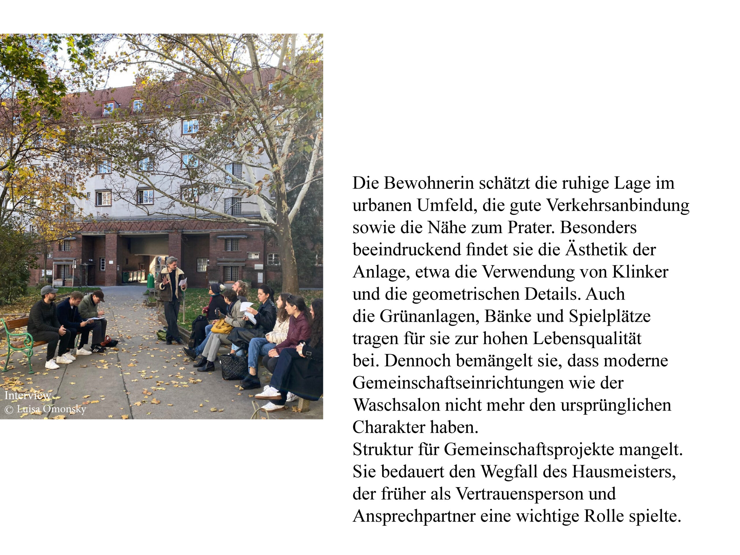 Anhand dieser drei sehr unterschiedlichen Beispiele setzten sich die Studierenden mit dem Denkmalpflegeplan als Werkzeug auseinander. Dieser diente nicht nur der strukturierten Analyse und Bewertung der baulichen Substanz, sondern wurde auch als Instrument für eine gestalterische Weiterentwicklung genutzt. Ziel war es, die städtebaulichen, architektonischen und sozialen Qualitäten der Siedlungen zu verstehen und ein Konzept für eine behutsame und zukunftsorientierte Entwicklung zu erarbeiten. Neben der bauhistorischen und räumlichen Analyse spielten die Perspektiven der heutigen Bewohnerinnen und Bewohner eine zentrale Rolle. Was wurde an der Siedlung geschätzt? Was sollte erhalten bleiben, was fehlte, was störte? Welche Rolle spielte der Denkmalschutz im Alltag? Die Antworten auf diese Fragen flossen direkt in die Konzepte ein.