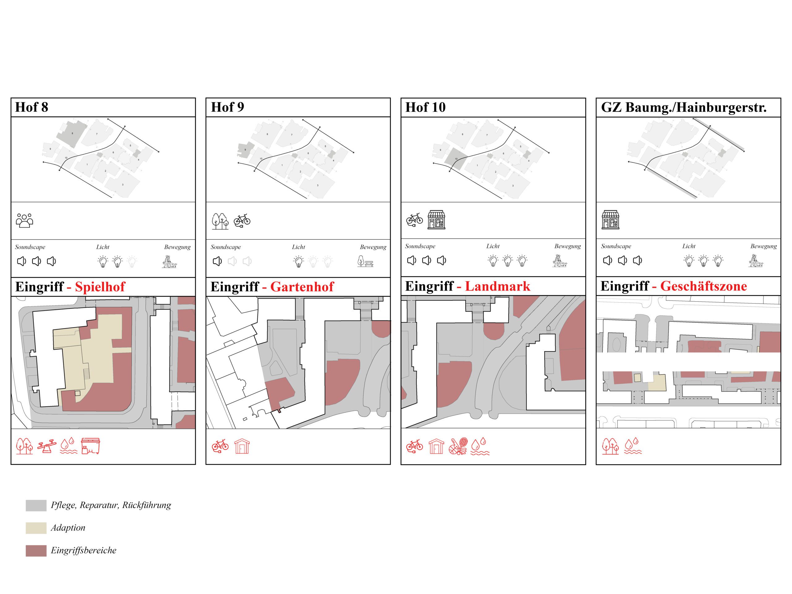 Der Entwurfsteil behandelt eine weiterführende Freiraumgestaltung. Nach der Analyse der Höfe und ihrer Qualitäten wurden Eingriffstiefen für eine langfristige Entwicklung definiert. Aus der Logik des Bestands werden dabei Bauteile entworfen, sowie daraus entwickelte Konfigurationen zu Kombinationen zusammengefügt. Ziel ist es, Anforderungen zur zukunftsfähigen Nutzung gerecht zu werden und dabei die Formensprache und Entstehungslogik des Rabenhofs weiterzuentwickeln, sodass ein Katalog zur fortschreitenden Ergänzung und Anpassung entstanden ist, der auch verlorene Qualitäten des sozialen Raums zurückbringt.
